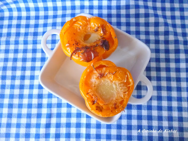 Arranje os pimentos, cortando a parte de cima, limpando as sementes e partes brancas de dentro.